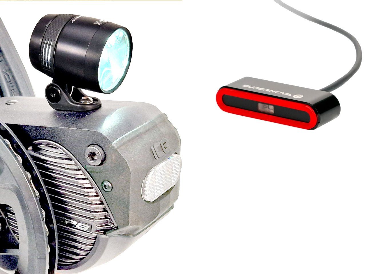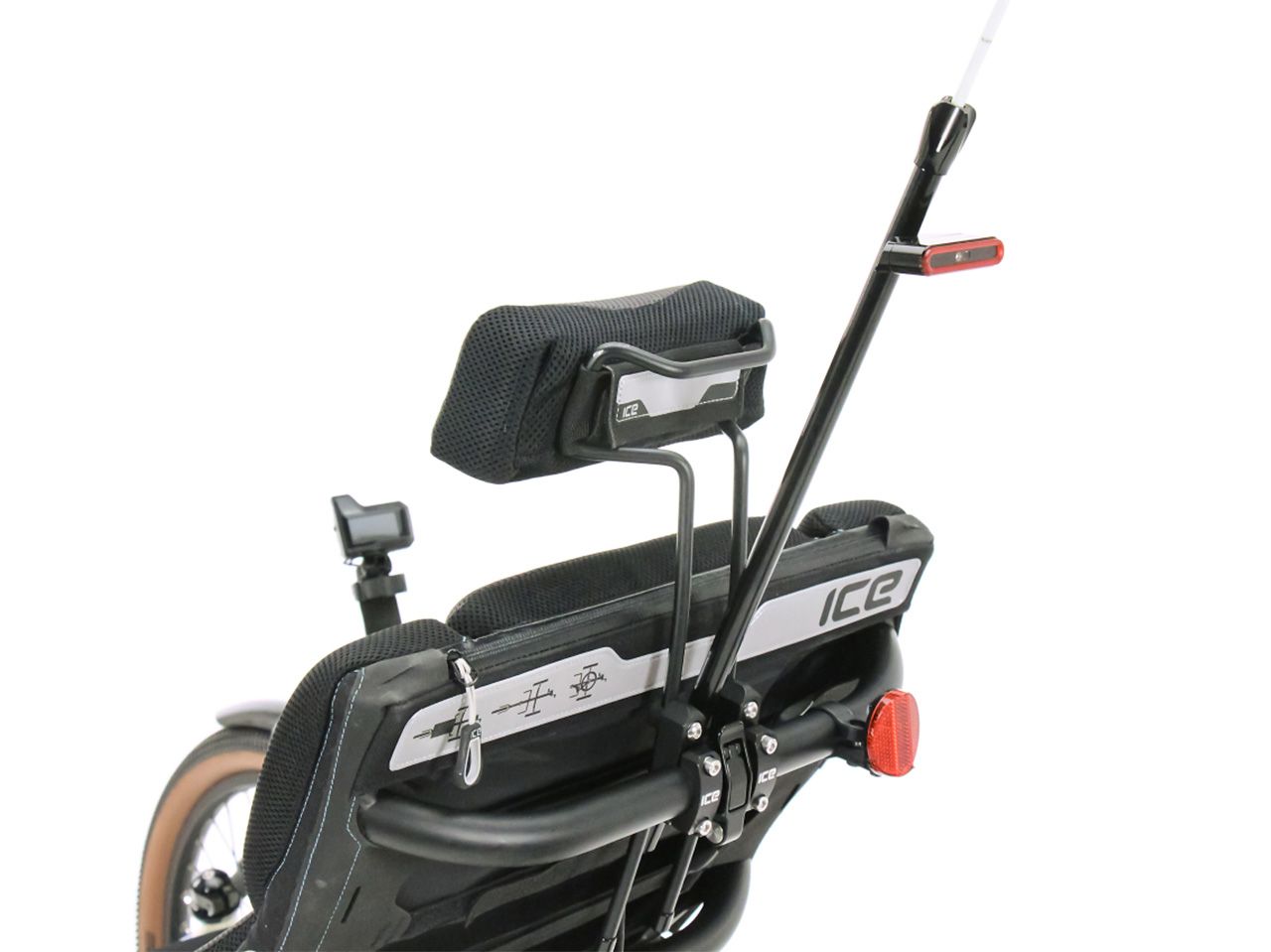 Lighting set for use with Shimano STEPS electric assist system. This installed set contains the front and rear lights, with the rear cable pre-fitted. B&M IQ-X E 150 LUX LED front light, Supernova TL3 Pro rear light with sensor brake light and an emergency strobe mounted to our ICE-specific light pole system. For all ICE Ergo-Flow and Ergo-Luxe mesh seats.